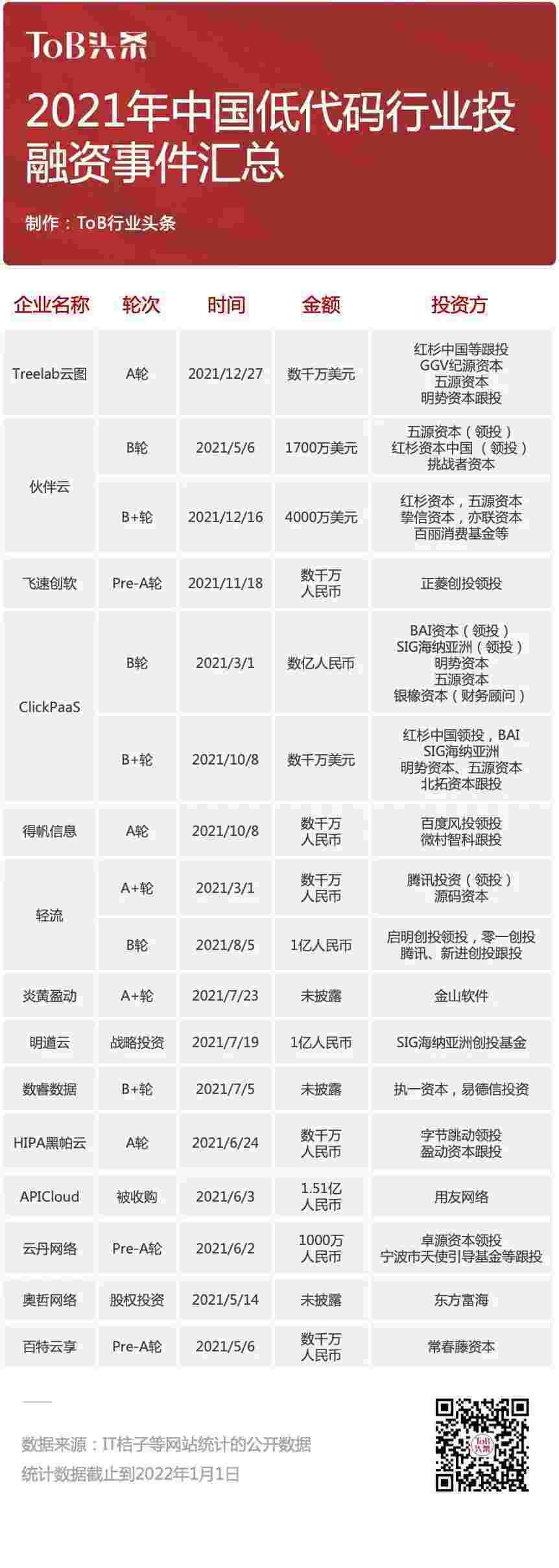 到2021年,,无/低代码投融资规模势头更甚,,,,其中包括轻流两轮融资(A+轮数千万人民币,,,,B轮近亿人民币)、、、OPPO钱包 两轮融资(B轮数亿人民币,,B+轮数千万美元)、、、百特云享数千万元Pre-A轮融资......